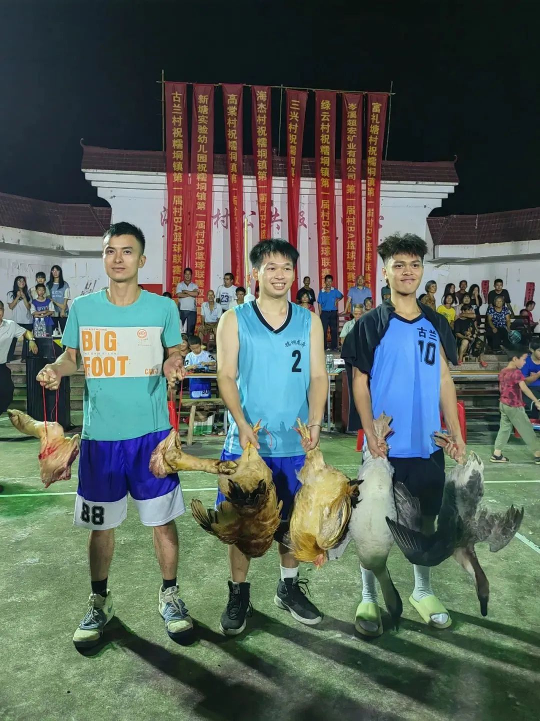經(jīng)過4天的激烈角逐,新塘實(shí)驗(yàn)幼兒園、海杰村和古蘭村奪得糯垌鎮(zhèn)第一屆村BA籃球聯(lián)賽前三名,并獲得雞、鵝、豬腳等特殊獎(jiǎng)品。
