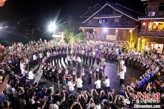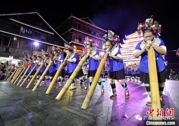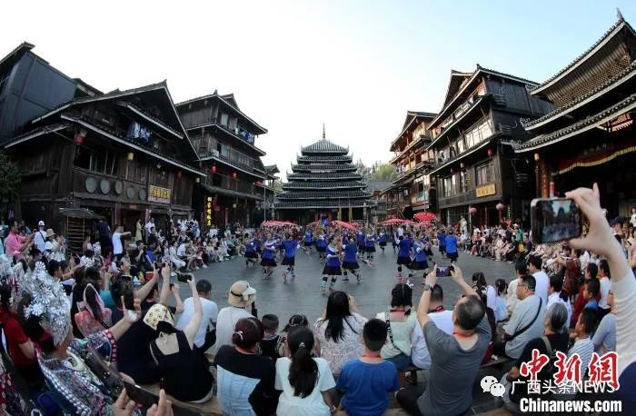 圖為游客在三江侗族自治縣程陽八寨景區(qū)觀賞侗族蘆笙踩堂表演。龔普康 攝