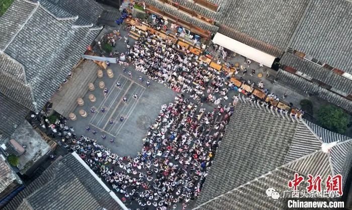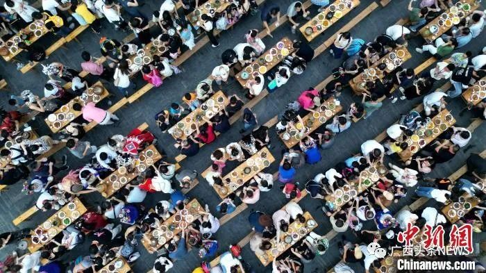 圖為游客在廣西三江侗族自治縣林溪鎮(zhèn)程陽八寨景區(qū)品嘗百家宴。龔普康 攝