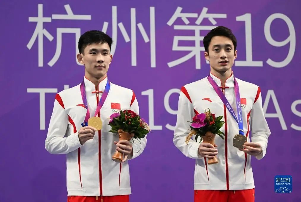 楊昊和練俊杰(右)以492.63分在跳水項目男子雙人10米臺奪得冠軍。(圖片來源:新華社)