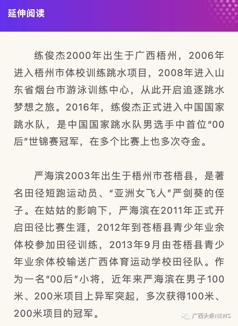 10月1日,杭州亞運會跳水項目男子雙人10米臺決賽中,楊昊/練俊杰以492.63分奪冠,摘得本屆亞運會中國跳水隊第四金。這也是2000年出生的來自廣西梧州的練俊杰獲得的首枚亞運會金牌。