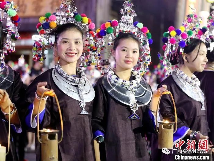 圖為在三江侗族自治縣林溪鎮(zhèn)平巖村馬安屯舉行的傳統(tǒng)千盞油燈蘆笙會上,侗族姑娘手提油燈參加活動。吳練勛 攝