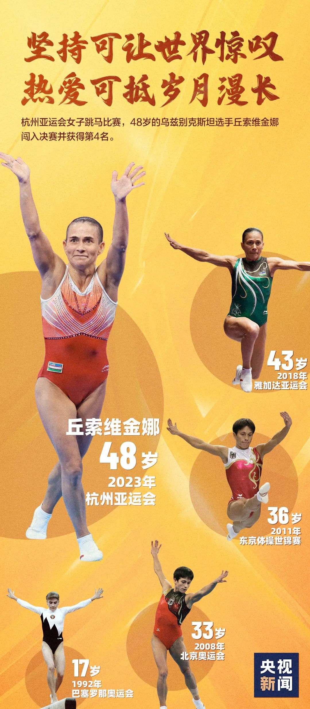 賽場上堅(jiān)持的老將,還有我們熟悉的“丘媽”。當(dāng)48歲老將丘索維金娜從跳馬上穩(wěn)穩(wěn)落地,掌聲和歡呼聲在場館內(nèi)久久回蕩。奧運(yùn)冠軍管晨辰也在觀眾席興奮地吶喊:“丘媽,我愛你!”在丘索維金娜的體操生涯中,有一個(gè)至關(guān)重要的人物——兒子阿廖沙。2002年,2歲的阿廖沙被確診白血病。為給兒子籌錢治病,已退役的她選擇重回賽場。兒子痊愈后,丘索維金娜依然奮戰(zhàn)在體操場上,她選擇為自己而戰(zhàn)。雖然這次杭州之旅最終未能獲得獎(jiǎng)牌,但她早已是傳奇。心懷熱愛,永遠(yuǎn)都是當(dāng)打之年。目前,她正在為獲得巴黎奧運(yùn)會(huì)的參賽資格而努力,如果成功,那將是“丘媽”的第九屆奧運(yùn)會(huì),她的紀(jì)錄將再次被改寫。