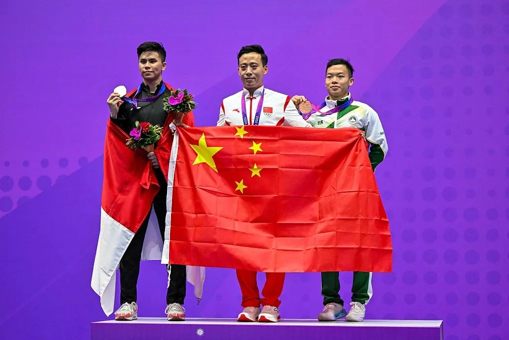 武術(shù)男子長拳決賽,中國隊(duì)選手孫培原奪冠,中國澳門選手宋子君摘得銅牌。頒獎(jiǎng)儀式上,孫培原將披著的五星紅旗,放到了他與宋子君的身前,宋子君也將花束放到背后。事后,孫培原在社交媒體上寫道:“我們永遠(yuǎn)是相親相愛的一家人?!?/span>賽場上