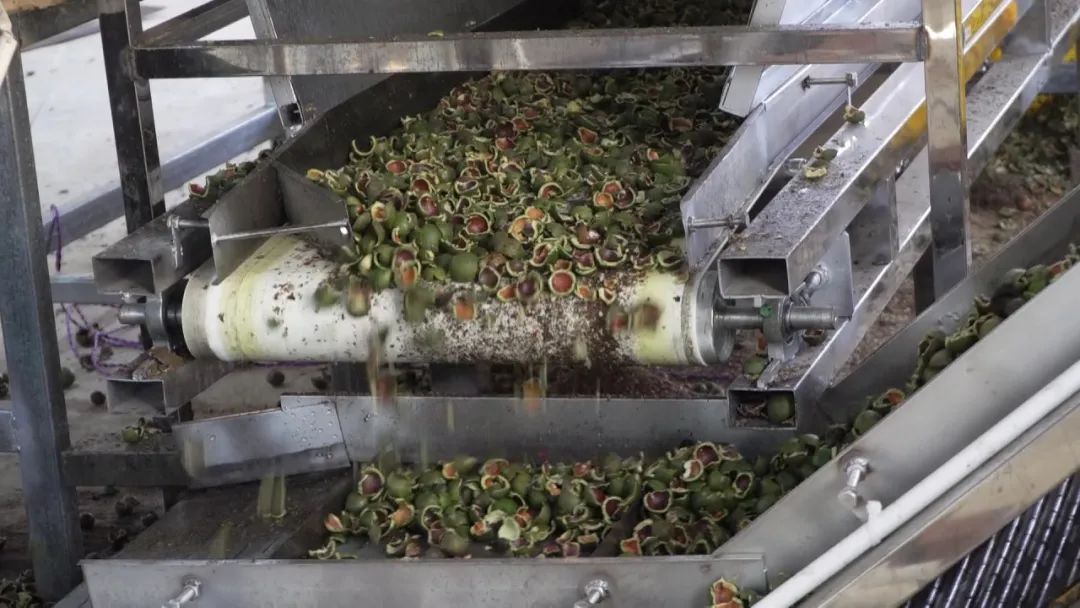近日,在岑溪市綠馬農(nóng)業(yè)發(fā)展有限公司澳洲堅(jiān)果加工廠,記者看到場(chǎng)地內(nèi)堆滿了剛剛采收回來(lái)的堅(jiān)果,工人們正忙著利用機(jī)械將青皮果進(jìn)行脫皮、水洗、分揀。