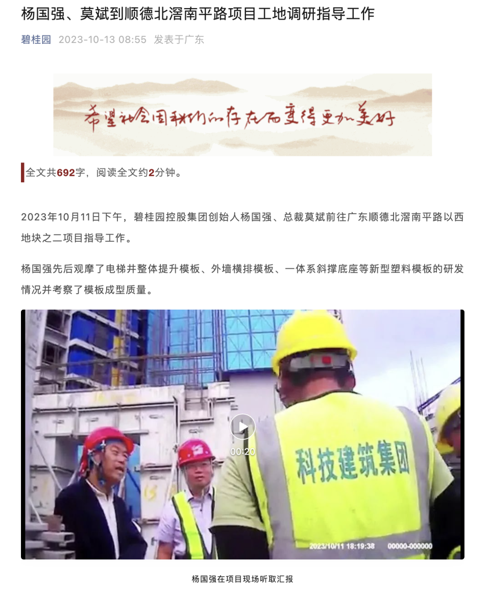 這篇官方通稿顯示,“10月11日下午,碧桂園控股集團創(chuàng)始人楊國強、總裁莫斌前往廣東順德北滘南平路以西地塊之二項目指導工作。楊國強先后觀摩了電梯井整體提升模板、外墻橫排模板、一體系斜撐底座等新型塑料模板的研發(fā)情況并考察了模板成型質量。”