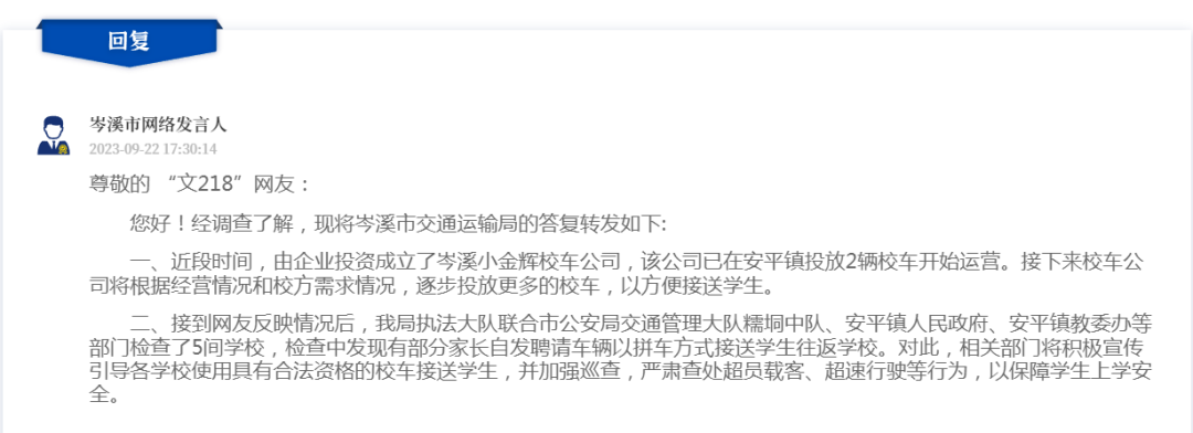 二、接到網(wǎng)友反映情況后,我局執(zhí)法大隊聯(lián)合市公安局交通管理大隊糯垌中隊、安平鎮(zhèn)人民政府、安平鎮(zhèn)教委辦等部門檢查了5間學校,檢查中發(fā)現(xiàn)有部分家長自發(fā)聘請車輛以拼車方式接送學生往返學校。對此,相關部門將積極宣傳引導各學校使用具有合法資格的校車接送學生,并加強巡查,嚴肅查處超員載客、超速行駛等行為,以保障學生上學安全。
