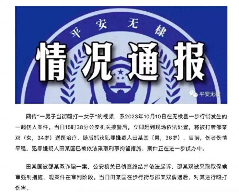 網(wǎng)傳“一男子當(dāng)街毆打一女子”的視頻,系2023年10月10日在無棣縣一步行街發(fā)生的一起傷人案件。當(dāng)日15時38分公安機關(guān)接警后,立即趕到現(xiàn)場依法處置,將被打者邵某雙(女,34歲)送醫(yī)治療,隨后抓獲犯罪嫌疑人田某國(男,36歲)。目前,傷者傷情平穩(wěn),犯罪嫌疑人田某國已被依法采取刑事拘留措施,案件正在進一步偵辦中。