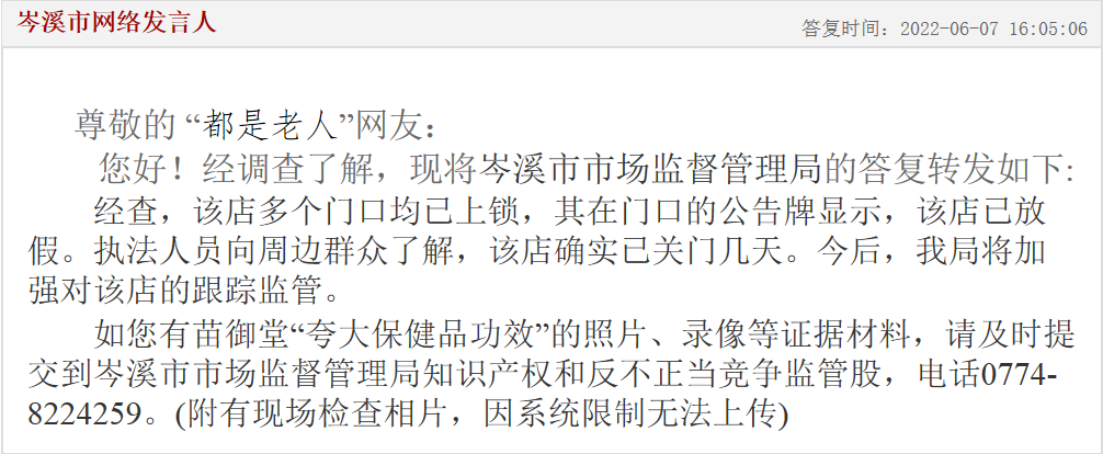 如您有苗御堂“夸大保健品功效”的照片、錄像等證據(jù)材料,請及時提交到岑溪市市場監(jiān)督管理局知識產(chǎn)權(quán)和反不正當(dāng)競爭監(jiān)管股,電話0774-8224259。(附有現(xiàn)場檢查相片,因系統(tǒng)限制無法上傳)。