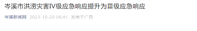 鑒于本輪強(qiáng)降雨過程持續(xù)時(shí)間長、累計(jì)雨量大,局部發(fā)生洪澇災(zāi)害的可能性較大,按照《岑溪市洪澇災(zāi)害應(yīng)急預(yù)案》的有關(guān)規(guī)定,經(jīng)市防汛抗旱指揮部批準(zhǔn),決定于2023年10月20日03時(shí)30分起將岑溪市洪澇災(zāi)害Ⅳ級(jí)應(yīng)急響應(yīng)提升為Ⅲ級(jí)應(yīng)急響應(yīng),請(qǐng)各鎮(zhèn)、各成員單位、各有關(guān)部門單位按照預(yù)案規(guī)定要求,做好各項(xiàng)防御和應(yīng)對(duì)工作,確保安全度汛。