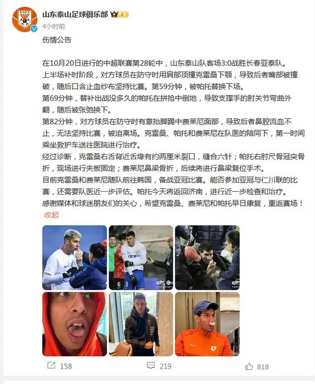 公告稱,在10月20日進行的中超聯(lián)賽第28輪中,山東泰山隊客場3:0戰(zhàn)勝長春亞泰隊。上半場補時階段,對方球員在防守時用肩部頂撞克雷桑下顎,導(dǎo)致后者嘴部被撞破,隨后口含止血紗布堅持比賽。第59分鐘,被帕托替換下場。
