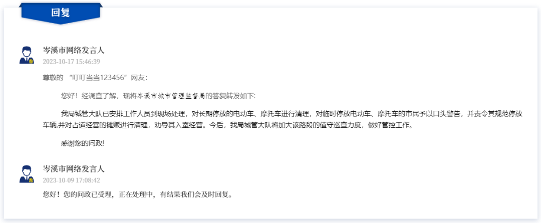 您好!經(jīng)調(diào)查了解,現(xiàn)將岑溪市城市管理監(jiān)督局的答復(fù)轉(zhuǎn)發(fā)如下: