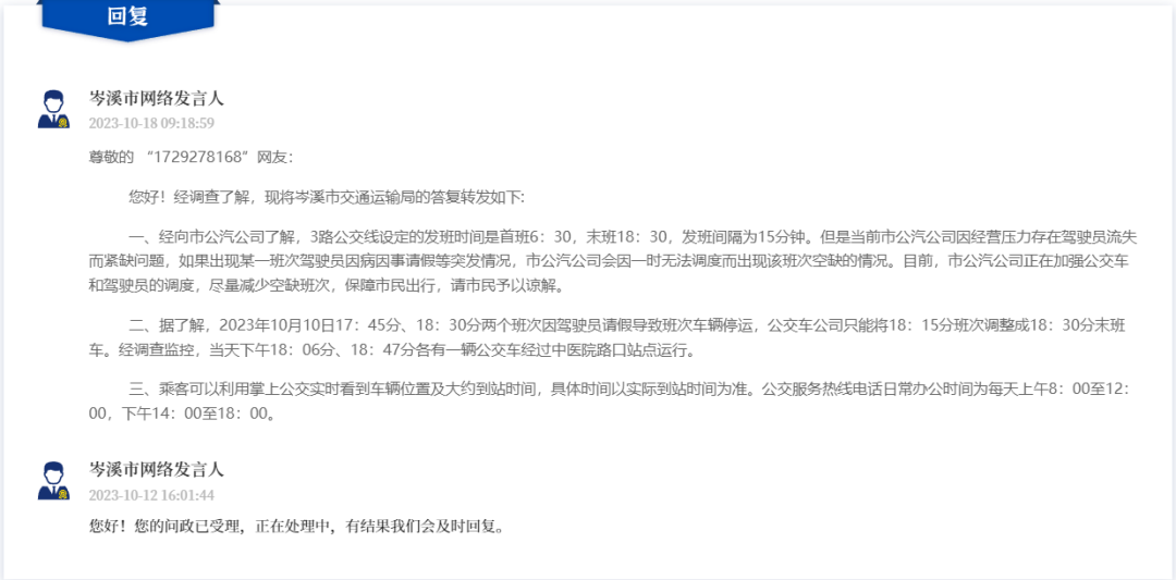 一、經(jīng)向市公汽公司了解,3路公交線設(shè)定的發(fā)班時(shí)間是首班6:30,末班18:30,發(fā)班間隔為15分鐘。但是當(dāng)前市公汽公司因經(jīng)營壓力存在駕駛員流失而緊缺問題,如果出現(xiàn)某一班次駕駛員因病因事請(qǐng)假等突發(fā)情況,市公汽公司會(huì)因一時(shí)無法調(diào)度而出現(xiàn)該班次空缺的情況。目前,市公汽公司正在加強(qiáng)公交車和駕駛員的調(diào)度,盡量減少空缺班次,保障市民出行,請(qǐng)市民予以諒解。