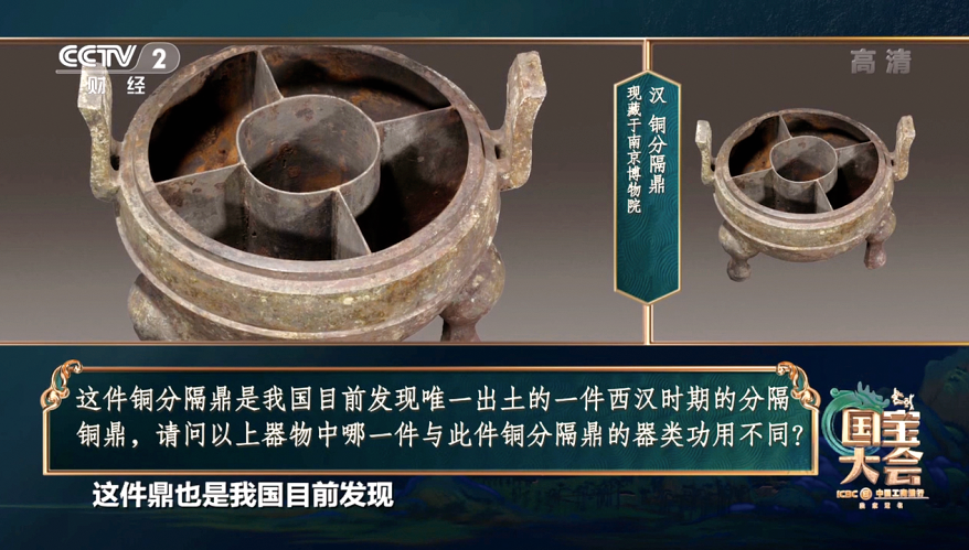 到了漢代,火鍋的類型就多起來了,人們曾經(jīng)在大云山漢墓發(fā)現(xiàn)一件形制罕見的青銅鼎。鼎內(nèi)被隔板分成了五個區(qū)域,比我們現(xiàn)在的四宮格火鍋還多一格,被稱為“五格濡鼎”。