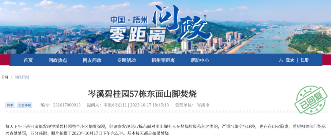 每天下午下班回家都發(fā)現(xiàn)岑溪碧桂園整個(gè)小區(qū)煙霧彌漫,經(jīng)調(diào)察發(fā)現(xiàn)是57棟東面對(duì)出山腳有人在焚燒垃圾秸稈之類的,嚴(yán)重污染空氣環(huán)境,也存在山火隱患,希望相關(guān)部門能盡興查處處罰,萬分感謝。照片拍攝于2023年10月17日下午六點(diǎn)半?;久刻於荚诜贌?/span>