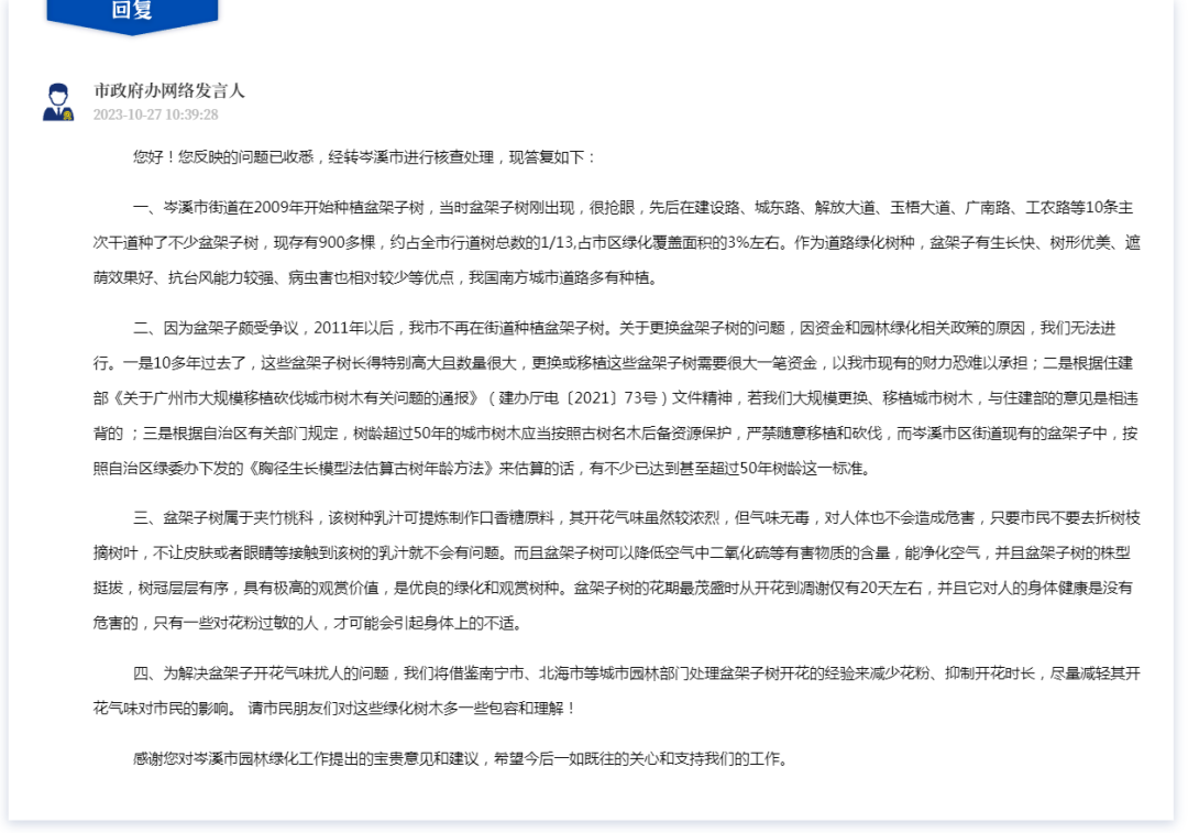 二、因為盆架子頗受爭議,2011年以后,我市不再在街道種植盆架子樹。關(guān)于更換盆架子樹的問題,因資金和園林綠化相關(guān)政策的原因,我們無法進(jìn)行。①是10多年過去了,這些盆架子樹長得特別高大且數(shù)量很大,更換或移植這些盆架子樹需要很大一筆資金,以我市現(xiàn)有的財力恐難以承擔(dān);②是根據(jù)住建部《關(guān)于廣州市大規(guī)模移植砍伐城市樹木有關(guān)問題的通報》(建辦廳電〔2021〕73號)文件精神,若我們大規(guī)模更換、移植城市樹木,與住建部的意見是相違背的 ;③是根據(jù)自治區(qū)有關(guān)部門規(guī)定,樹齡超過50年的城市樹木應(yīng)當(dāng)按照古樹名木后備資源保護(hù),嚴(yán)禁隨意移植和砍伐,而岑溪市區(qū)街道現(xiàn)有的盆架子中,按照自治區(qū)綠委辦下發(fā)的《胸徑生長模型法估算古樹年齡方法》來估算的話,有不少已達(dá)到甚至超過50年樹齡這一標(biāo)準(zhǔn)。三、盆架子樹屬于夾竹桃科,該樹種乳汁可提煉制作口香糖原料,其開花氣味雖然較濃烈,但氣味無毒,對人體也不會造成危害,只要市民不要去折樹枝摘樹葉,不讓皮膚或者眼睛等接觸到該樹的乳汁就不會有問題。而且盆架子樹可以降低空氣中二氧化硫等有害物質(zhì)的含量,能凈化空氣,并且盆架子樹的株型挺拔,樹冠層層有序,具有極高的觀賞價值,是優(yōu)良的綠化和觀賞樹種。盆架子樹的花期最茂盛時從開花到凋謝僅有20天左右,并且它對人的身體健康是沒有危害的,只有一些對花粉過敏的人,才可能會引起身體上的不適。四、為解決盆架子開花氣味擾人的問題,我們將借鑒南寧市、北海市等城市園林部門處理盆架子樹開花的經(jīng)驗來減少花粉、抑制開花時長,盡量減輕其開花氣味對市民的影響。 請市民朋友們對這些綠化樹木多一些包容和理解!感謝您對岑溪市園林綠化工作提出的寶貴意見和建議,希望今后一如既往的關(guān)心和支持我們的工作。