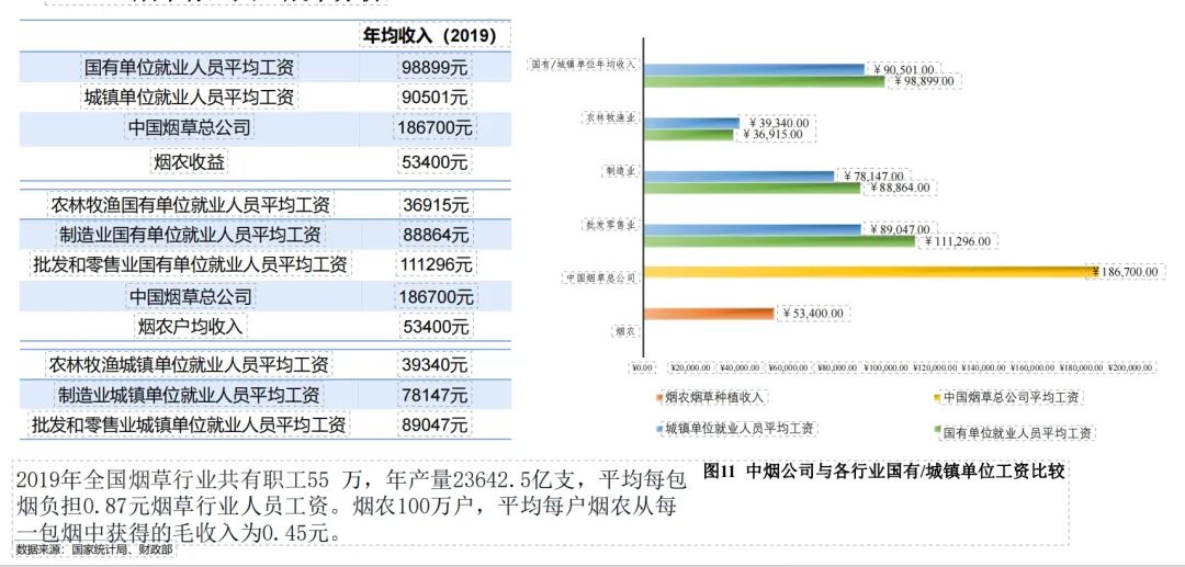 低煙葉采購(gòu)成本和高銷售利潤(rùn)率也導(dǎo)致從業(yè)人員收入出現(xiàn)兩極分化。報(bào)告顯示,2019年,中國(guó)煙草總公司平均年薪為186700元/人,高于制造業(yè)國(guó)有單位就業(yè)人員年均收入的88864元和城鎮(zhèn)單位就業(yè)人員平均工資的90501元。