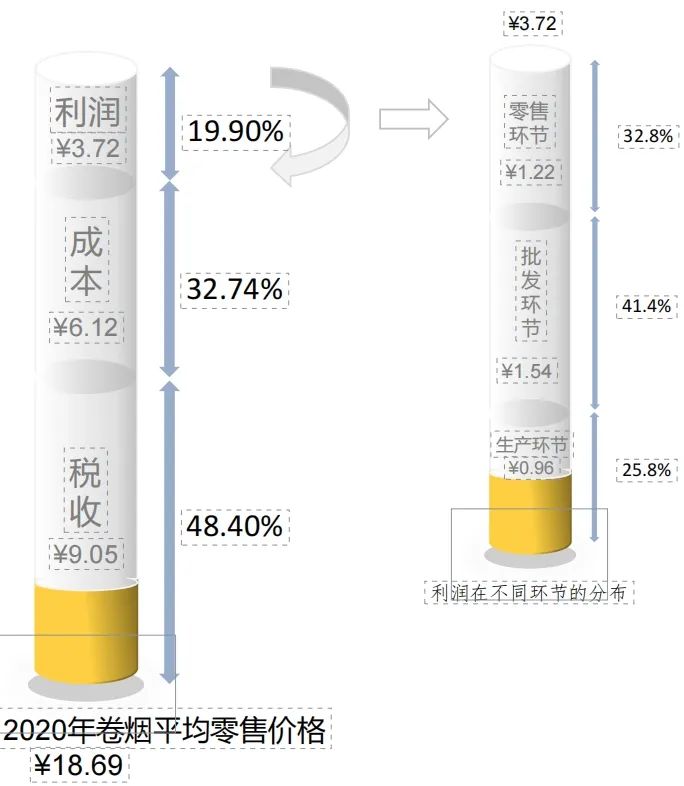 根據(jù)前述報(bào)告,在一包零售均價(jià)為18.69元的卷煙中,成本為6.12元,占比約三成;利潤(rùn)為3.72元,占比約二成。