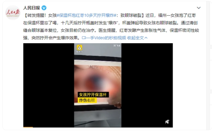 福州一女孩泡了紅棗在保溫杯里忘了喝,十幾天后擰開瓶蓋時(shí)發(fā)生“爆炸”,杯蓋彈起杯蓋彈起致使右眼右眼球破裂,眼球內(nèi)全是血。
