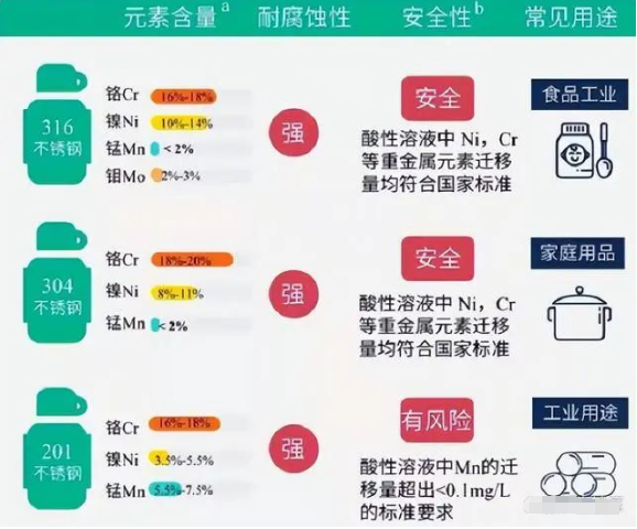 國(guó)家規(guī)定在食品級(jí)不銹鋼中,304不銹鋼中的鎳含量應(yīng)在8%-11%、鉻含量應(yīng)在18%,316不銹鋼中鎳含量應(yīng)在10%-14%,鉻含量應(yīng)在18%。
