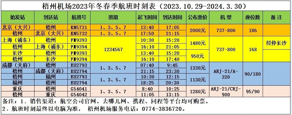 ▲圖源梧州廣播電視臺另外,梧州西江機場從今年10月29日起至明年3月30日,執(zhí)行冬春季航班計劃。換季后,機場繼續(xù)執(zhí)行北京(大興)至梧州、上海(浦東)至長沙至梧州、成都(天府)至梧州至福州航線,新增梧州至重慶航線,具體如下: