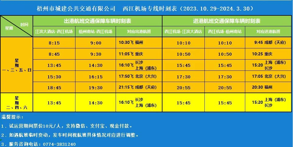 據(jù)悉,為方便市民出行,目前開通了市區(qū)到機場的交通專線,始發(fā)站為江濱國際大酒店,經(jīng)停梧州南站后直達(dá)機場候機樓。機場在航班起飛前45分鐘停止辦理值機手續(xù),由于市區(qū)離機場較遠(yuǎn),提醒各位旅客朋友需把控好出行時間,避免誤機。
