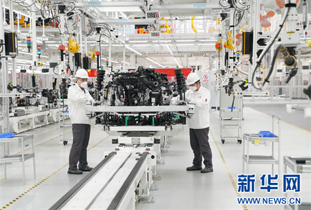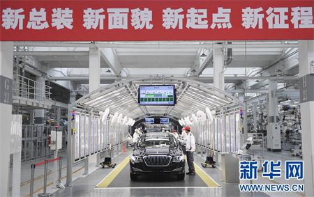 工人在位于吉林長春的一汽紅旗繁榮工廠總裝車間檢查車輛。