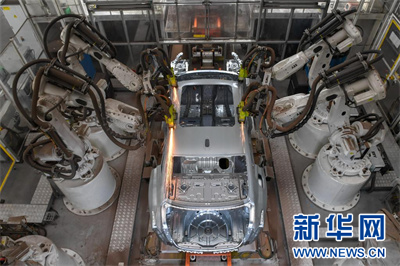 在位于吉林省長春市的一汽紅旗繁榮工廠焊裝車間內(nèi),焊裝機器人在生產(chǎn)線上焊接車身。