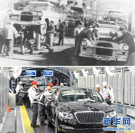 上圖為20世紀50年代拍攝的第一批紅旗轎車生產(chǎn)線(資料照片);下圖為在一汽紅旗總裝車間內(nèi),一汽紅旗職工在對生產(chǎn)的紅旗轎車進行靜檢作業(yè)。