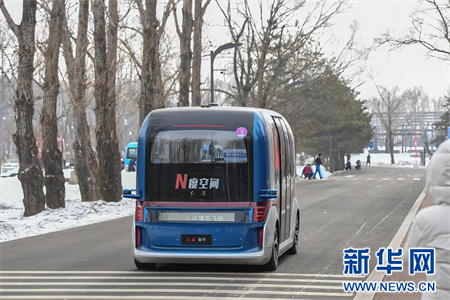 2021年1月12日,在長春凈月潭國家森林公園,一汽紅旗參賽車輛在2021中國長春(國際)無人駕駛汽車冰雪挑戰(zhàn)賽中行駛。
