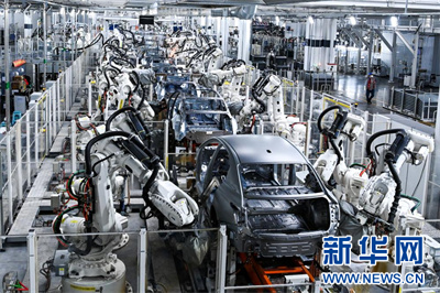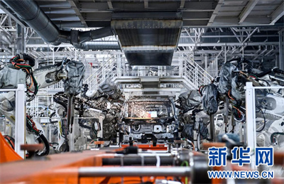 在吉林長春中國第一汽車集團有限公司紅旗繁榮工廠焊裝車間內(nèi),焊裝機器人在生產(chǎn)線上焊接車身。