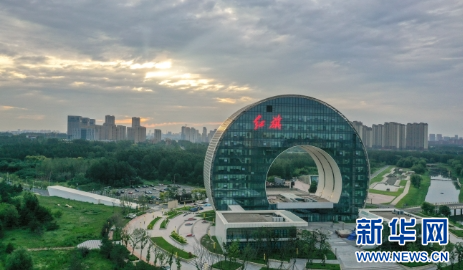 無人機拍攝的晨曦中的一汽紅旗創(chuàng)新大廈。