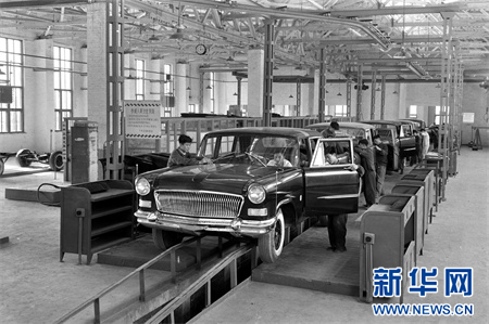 1959年,長春第一汽車制造廠試生產(chǎn)“紅旗”牌高級轎車正在進行總裝配。
