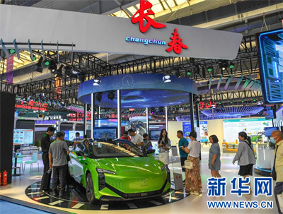 人們在第十四屆中國—東北亞博覽會吉林省長春市展臺參觀一汽紅旗新能源車型。