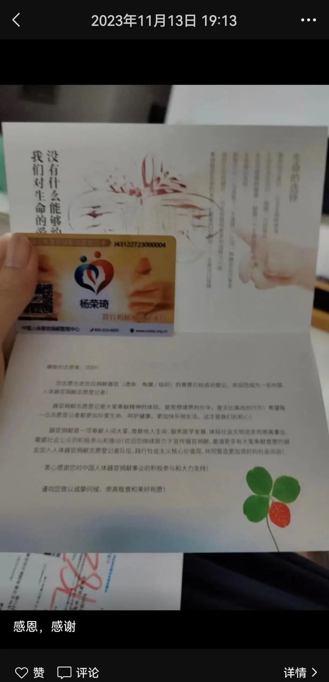 父母慢慢接受了他的想法。隨后,楊榮琦在中國人體器官捐獻(xiàn)平臺完成捐獻(xiàn)登記,并收到國家器官捐獻(xiàn)中心寄來的實(shí)體卡。