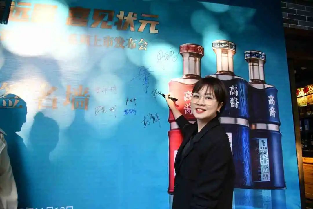 ▲上海貴酒廣西大區(qū)梧州區(qū)域總監(jiān)梁萬千和漁家灣飯店總經(jīng)理肖顯藝為高醬狀元系列產(chǎn)品揭幕