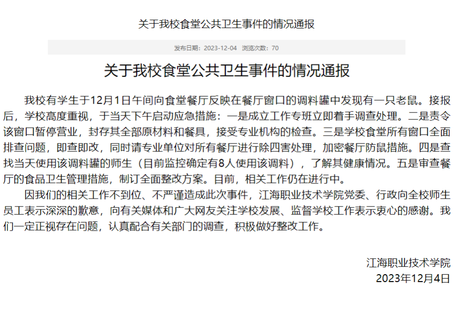 12月4日,該校通報(bào):我校有學(xué)生于12月1日午間向食堂餐廳反映在餐廳窗口的調(diào)料罐中發(fā)現(xiàn)有一只老鼠。接報(bào)后,學(xué)校高度重視,于當(dāng)天下午啟動(dòng)應(yīng)急措施:一是成立工作專班立即著手調(diào)查處理。二是責(zé)令該窗口暫停營業(yè),封存其全部原材料和餐具,接受專業(yè)機(jī)構(gòu)的檢查。三是學(xué)校食堂所有窗口全面排查問題,即查即改,同時(shí)請專業(yè)單位對所有餐廳進(jìn)行除四害處理,加密餐廳防鼠措施。四是查找當(dāng)天使用該調(diào)料罐的師生(目前監(jiān)控確定有8人使用該調(diào)料),了解其健康情況。五是審查餐廳的食品衛(wèi)生管理措施,制訂全面整改方案。目前,相關(guān)工作仍在進(jìn)行中。因我們的相關(guān)工作不到位、不嚴(yán)謹(jǐn)造成此次事件,江海職業(yè)技術(shù)學(xué)院黨委、行政向全校師生員工表示深深的歉意,向有關(guān)媒體和廣大網(wǎng)友關(guān)注學(xué)校發(fā)展、監(jiān)督學(xué)校工作表示衷心的感謝。我們一定正視存在問題,認(rèn)真配合有關(guān)部門的調(diào)查,積極做好整改工作。