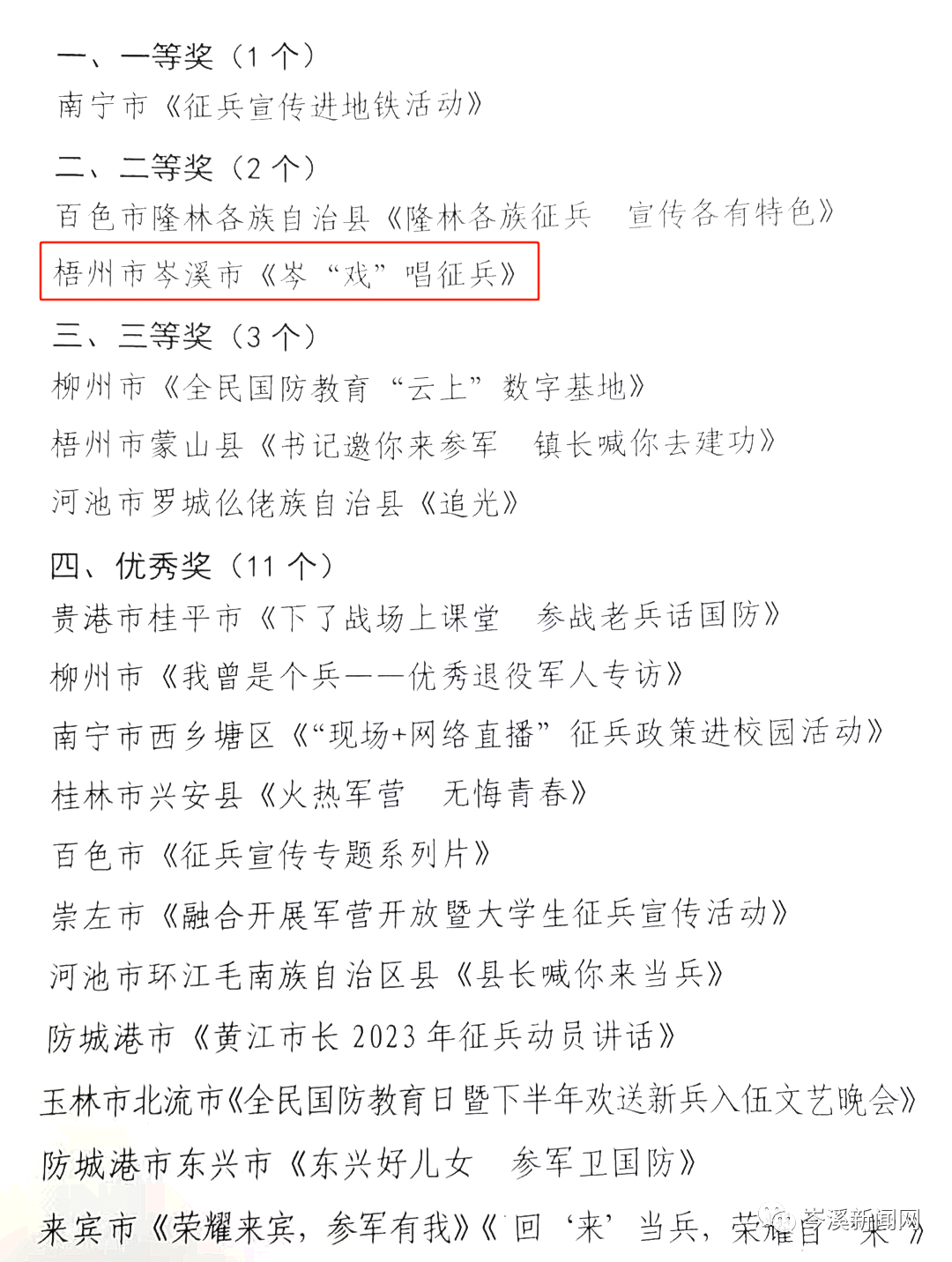 近日,自治區(qū)征兵宣傳優(yōu)秀案例獲獎(jiǎng)名單出爐。其中,由中共岑溪市委宣傳部、岑溪市人民政府征兵辦公室、岑溪市文化廣電體育和旅游局、岑溪市融媒體中心聯(lián)合制作的短視頻《岑“戲”唱征兵》獲得二等獎(jiǎng)。兵