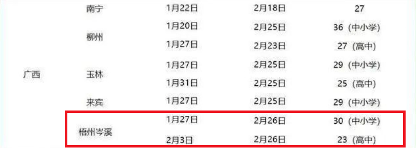 廣西部分地市中小學(xué)寒假時(shí)間安排
