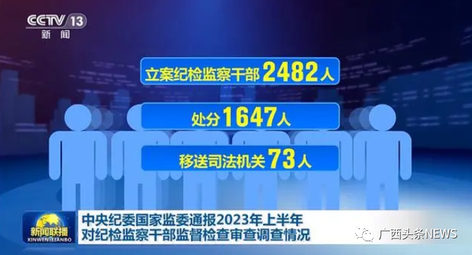 根據(jù)中央紀(jì)委國家監(jiān)委此前通報,2023年上半年,全國紀(jì)檢監(jiān)察系統(tǒng)共接收涉及紀(jì)檢監(jiān)察干部問題線索或反映2.02萬余件次,處置涉及紀(jì)檢監(jiān)察干部問題線索1.87萬余件,談話函詢紀(jì)檢監(jiān)察干部6647人次,立案紀(jì)檢監(jiān)察干部2482人,處分1647人,移送司法機(jī)關(guān)73人,其中,處分廳局級干部54人、縣處級285人。