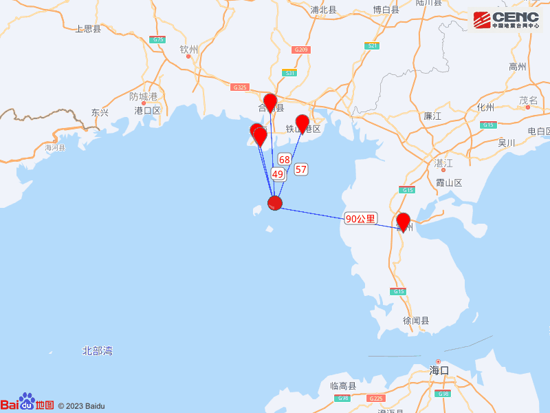 周邊縣城:震中距銀海區(qū)46公里、距海城區(qū)49公里、距鐵山港區(qū)57公里、距合浦縣68公里、距廣東雷州市90公里,距北海市50公里,距??谑?63公里。