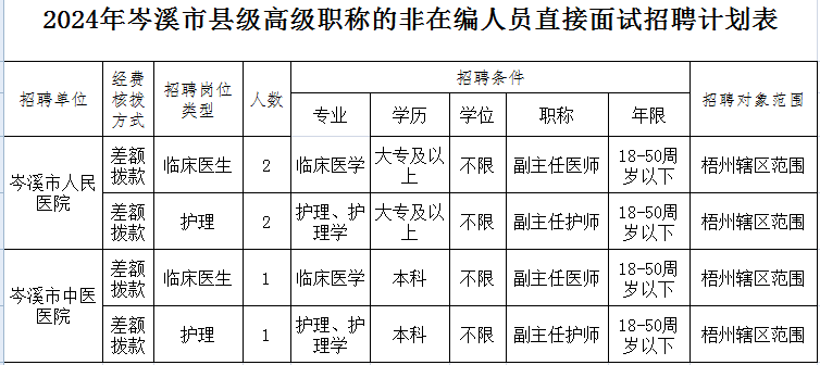 為滿足2024年我市事業(yè)單位補(bǔ)充人員的需要,根據(jù)《梧州市事業(yè)單位公開招聘人員實(shí)施細(xì)則》(梧政發(fā)﹝2012﹞52號)和《梧州市醫(yī)療衛(wèi)生計生人才激勵辦法(試行)》(梧辦發(fā)﹝2017﹞44號)文件精神及有關(guān)規(guī)定,現(xiàn)通過直接面試方式面向高校畢業(yè)生招聘事業(yè)單位人員68人,通過直接考核方式面向取得縣級高級職稱的非在編人員招聘6人。
