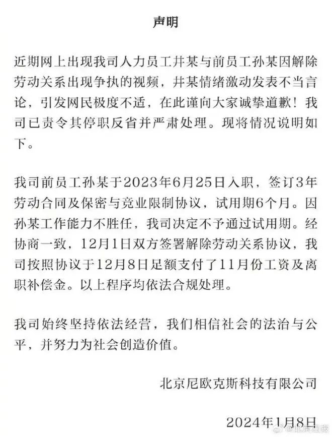 1月8日凌晨,北京尼歐克斯科技有限公司就此事發(fā)布聲明稱:近期網(wǎng)上出現(xiàn)我司人力員工井某與前員工孫某因解除勞動關(guān)系出現(xiàn)爭執(zhí)的視頻,井某情緒激動發(fā)表不當(dāng)言論,引發(fā)網(wǎng)民極度不適,在此謹(jǐn)向大家誠摯道歉!我司已責(zé)令其停職反省并嚴(yán)肅處理。