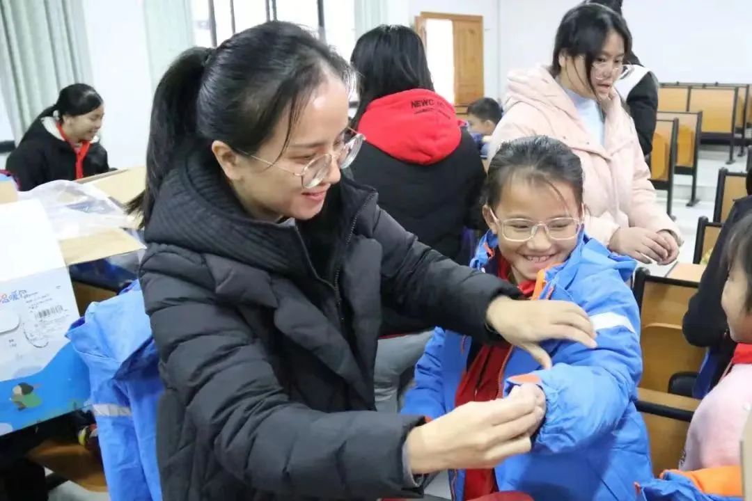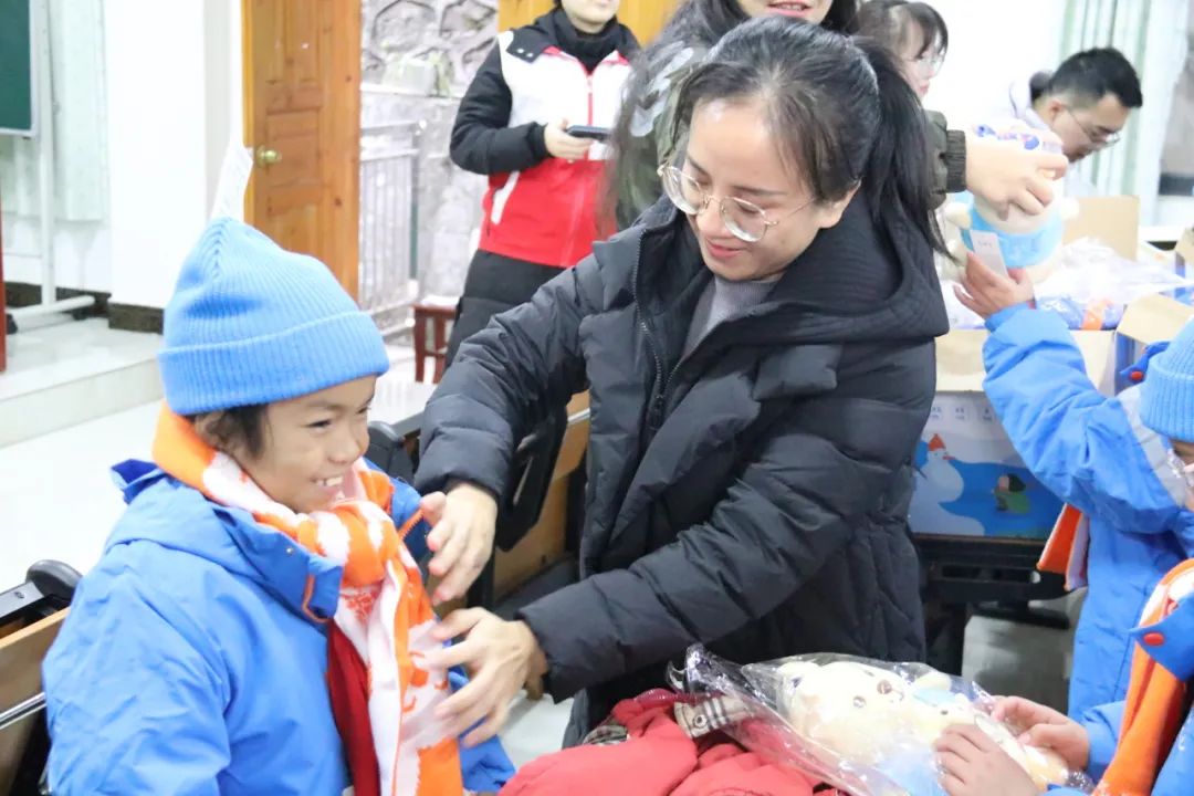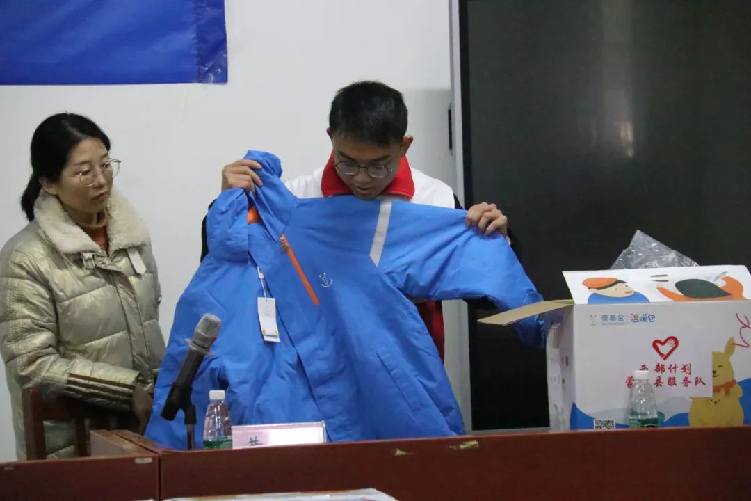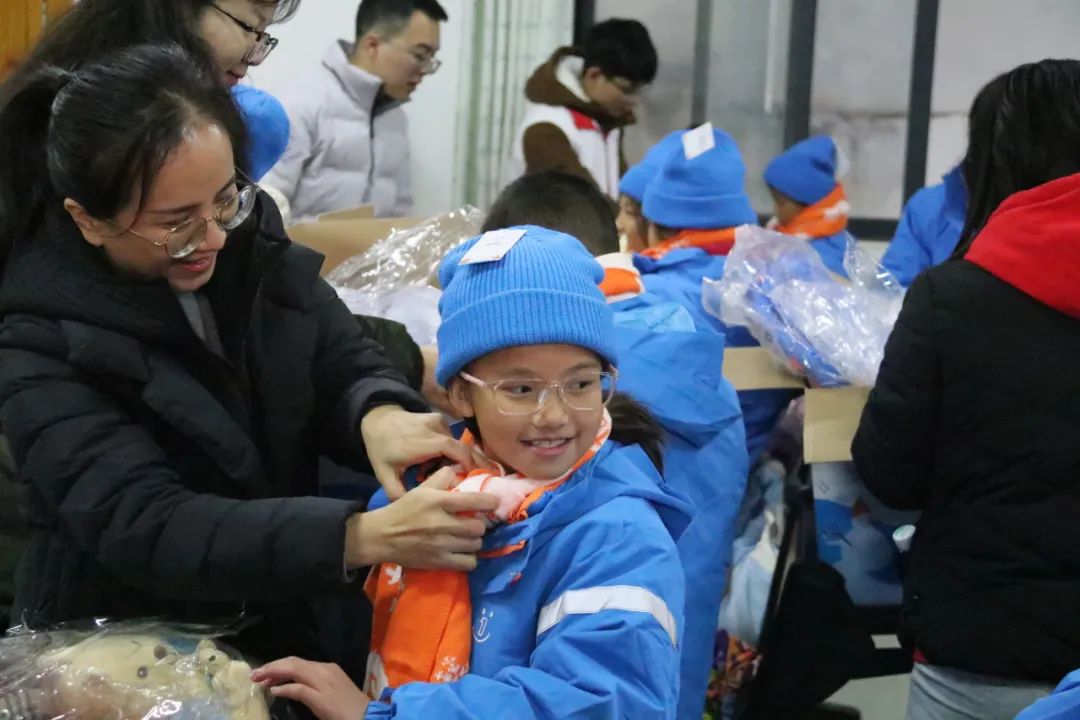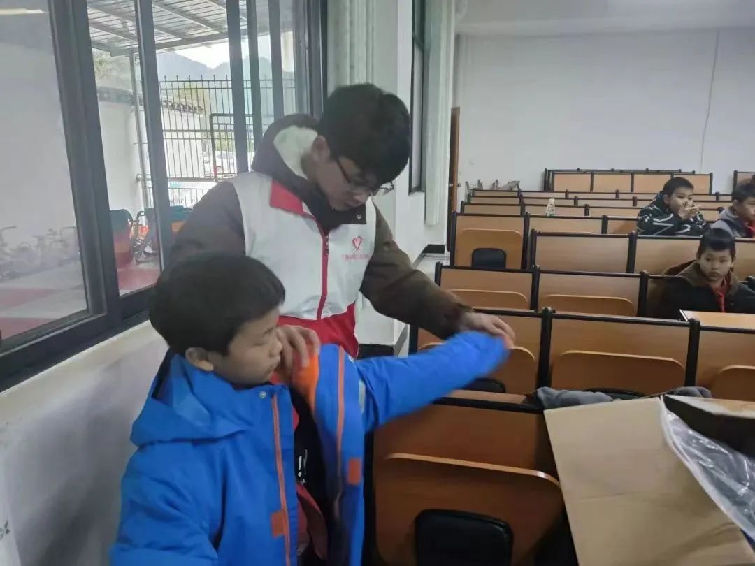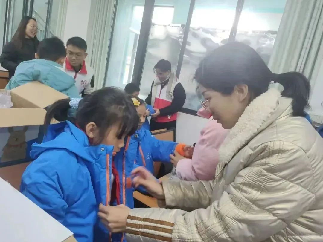 志愿者們先是對(duì)溫暖包里面的物資進(jìn)行了介紹,然后大家細(xì)心地為孩子們穿上新衣,戴上帽子圍巾,鼓勵(lì)孩子們好好學(xué)習(xí),保持昂揚(yáng)的斗志,再接再厲。