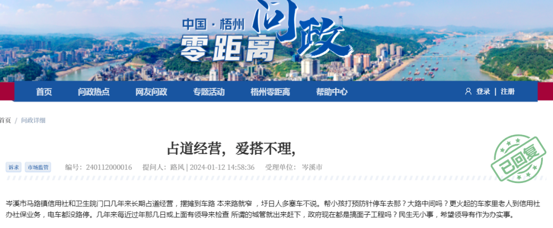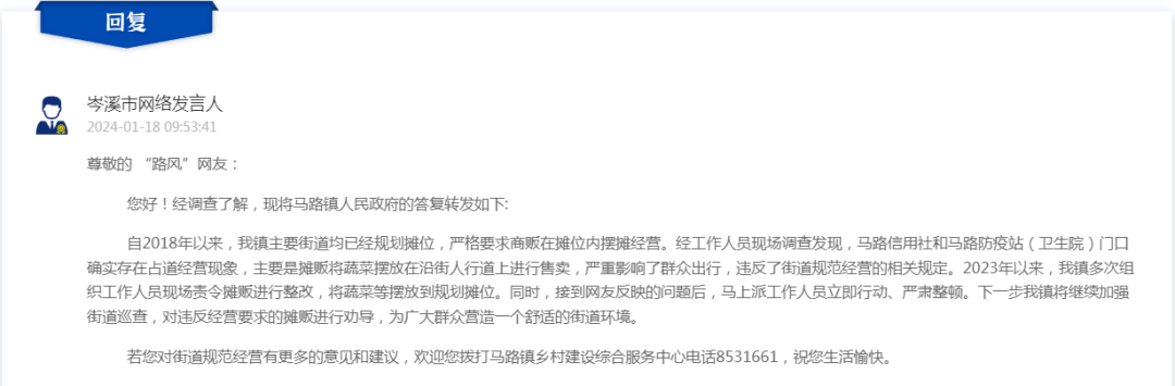 自2018年以來,我鎮(zhèn)主要街道均已經(jīng)規(guī)劃攤位,嚴格要求商販在攤位內擺攤經(jīng)營。經(jīng)工作人員現(xiàn)場調查發(fā)現(xiàn),馬路信用社和馬路防疫站(衛(wèi)生院)門口確實存在占道經(jīng)營現(xiàn)象,主要是攤販將蔬菜擺放在沿街人行道上進行售賣,嚴重影響了群眾出行,違反了街道規(guī)范經(jīng)營的相關規(guī)定。2023年以來,我鎮(zhèn)多次組織工作人員現(xiàn)場責令攤販進行整改,將蔬菜等擺放到規(guī)劃攤位。同時,接到網(wǎng)友反映的問題后,馬上派工作人員立即行動、嚴肅整頓。下一步我鎮(zhèn)將繼續(xù)加強街道巡查,對違反經(jīng)營要求的攤販進行勸導,為廣大群眾營造一個舒適的街道環(huán)境。