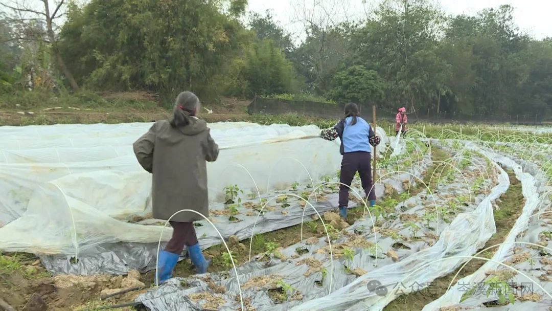在大業(yè)鎮(zhèn)會村村的蔬菜種植基地里,村民們正對小拱棚進行棚骨固定和塑料薄膜覆蓋,確保農(nóng)作物安全過冬。