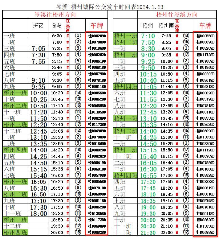 岑溪首班 6:10---末班(探花 14:00 岑溪總站 14:20)梧州首班 7:10---末班(金暉站 15:40 梧州南高鐵站 16:15)2 月 10 日(年初一)休息停運(yùn) 1 天梧州 7:10---末班 22:00 (梧州南高鐵站)