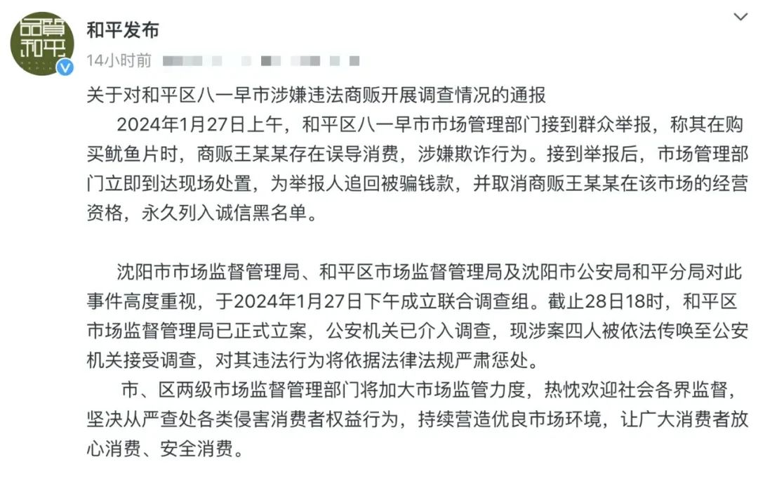 28日,沈陽市和平區(qū)市場(chǎng)監(jiān)督管理局發(fā)布通報(bào)