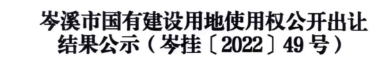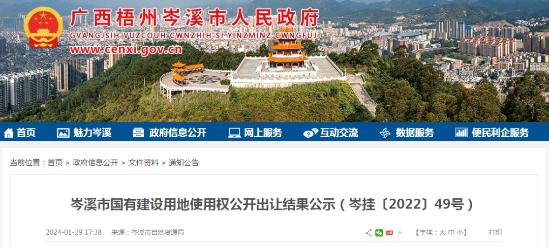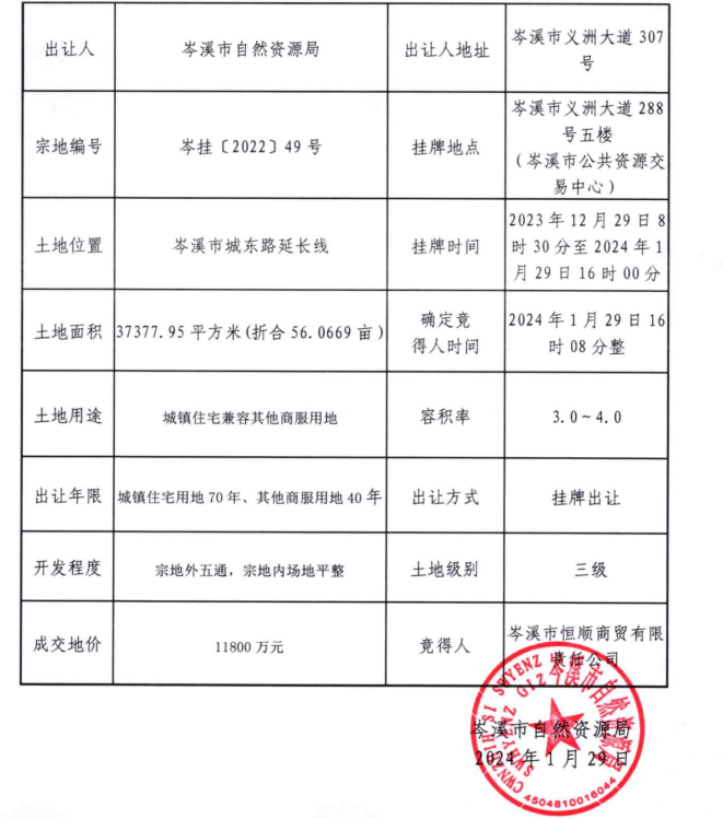 根據(jù)國家土地管理有關法律、法規(guī)規(guī)定,經(jīng)市人民政府批準,我局于2023年12月29日8時至2024年1月29日16時00分期間,公開出讓位于岑溪市城東路延長線,面積為37377.95平方米的國有建設用地使用權?,F(xiàn)出讓活動結(jié)束,將出讓結(jié)果予以公示,公示期5天。對公示結(jié)果有異議的,請以書面形式,并署真實姓名和聯(lián)系地址,于2024年2月3日前郵寄或直接送岑溪市自然資源局。
