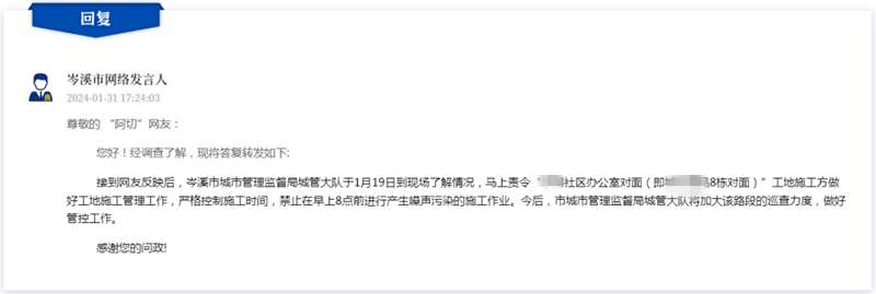 接到網(wǎng)友反映后,岑溪市城市管理監(jiān)督局城管大隊(duì)于1月19日到現(xiàn)場(chǎng)了解情況,馬上責(zé)令工地施工方做好工地施工管理工作,嚴(yán)格控制施工時(shí)間,禁止在早上8點(diǎn)前進(jìn)行產(chǎn)生噪聲污染的施工作業(yè)。今后,市城市管理監(jiān)督局城管大隊(duì)將加大該路段的巡查力度,做好管控工作。